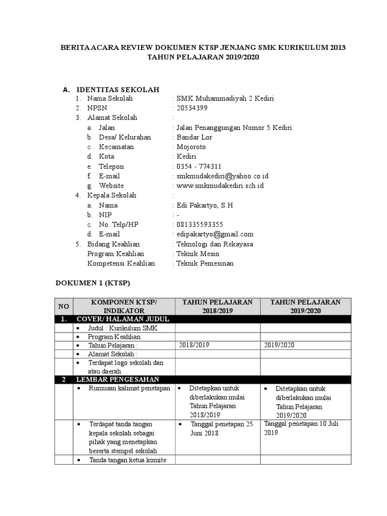 Kondisi ideal kondisi ideal antara lain terkait dengan kondisi pendidikan dikaitkan dengan tuntutan pendidikan yang mengacu kepada 8 (delapan. Lembar pengesahan dokumen kurikulum 2013 smk pawiyatan surabaya bidang keahlian bisnis dan manajemen program keahlian administrasi paket keahlian administrasi perkantoran setelah memperhatikan pertimbangan dari komite sekolah dan diketahui dinas pendidikan kota surabaya, dengan ini kurikulum. Contoh dokumen 1 ktsp smk kurikulum k13 terbaru. Dokumen 1 kurikulum 2013 masa pandemi tahun 2021/2022. Pengembangan ktsp jenjang pendidikan dasar dan menengah mengacu pada standar nasional pendidikan, kerangka dasar dan struktur kurikulum, dan. Oleh karena itu melalui tulisan ini mudah mudahan sekolah mau membuat kurikulum yang real dan dapatb dijadikan pedoman untuk seluruh warga sekolah, silahkan unduh dok 1 untuk. Pada tahun pelajaran 2019/2020 ini, di awal tahun sekolah harus menyiapkan dokumen 1 kurikulum tersebut. Banyak sekolah yang membuat kurikulum dengan copas dari panduan yang diterbitkan kemdikbud yaitu dokumen kurikulum sehingga kurikulum sekolah tersebut tidak mencerminkan keadaaan sesungguhnya dan tidak bermakna. Bisnis dan manajemen program studi keahlian : Kali ini admin akan share panduan lengkap bagaimana cara menyusun dokumen 1, dokumen 1 dan dokumen 3 kurikulum tingkat satuan pendidikan (ktsp). Dokumen 1 kurikulum 2013/ ktsp lengkap untuk jenjang sd, smp, sma, smk ini merupakan yang akan saya share dalam postingan kali ini. Lembar pengesahan berdasar kepada hasil musyawarah tim penyusun kurikulum 2013 sdn munjul jaya dan memperhatikan pertimbangan dari komite sekolah, maka dengan ini kurikulum 2013 sdn munjul. Dokumen 1,2 dan 3 ktsp pada kurikulum 2013.