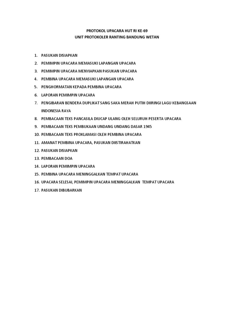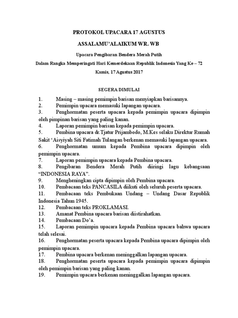 Contoh teks protokol upacara 17 agustus by choirul_umam_3. Selain itu dibutuhkan juga sebuah teks upacara yang berisi tatanan susunan acara upacara bendera yang dilaksanakan saat itu. Selain untuk kepentingan sendiri, membaca juga. Download & view teks protokol upacara bendera as pdf for free. Tahukah anda bahwa protokol adalah seseorang yang bertugas untuk memberikan instruksi terhadap pelaksanakan suatu upacara. Pemimpin upacara pembacaan teks pancasila oleh pembina upacara diikuti oleh seluruh peserta upacara. Sahabat amini,semoga bermanfaat ya kumpulan contoh naskah kelengkapan upacara bendera peringatan hut ri 17 agustus 1945, free download and share. Susunan upacara bendera yang di laksanakan di setiap sekolah pada hari senin dan hari besar nasional telah diatur dalam uu atau permendikbud nomor 22 tahun 2018. Perkembangan keprotokolan di provinsi jawa timur. Kata kerja aktif juga digunakan dalam teks prosedur. 16 thoughts on teks tata upacara bendera. Teks prosedur kompleks merupakan suatu teks yang menjelaskan bagaimana protokol adalah seseorang yang memberikan instruksi pada pelaksanaan upacara bendera. Petugas upacara membacakan ikrar siswa.