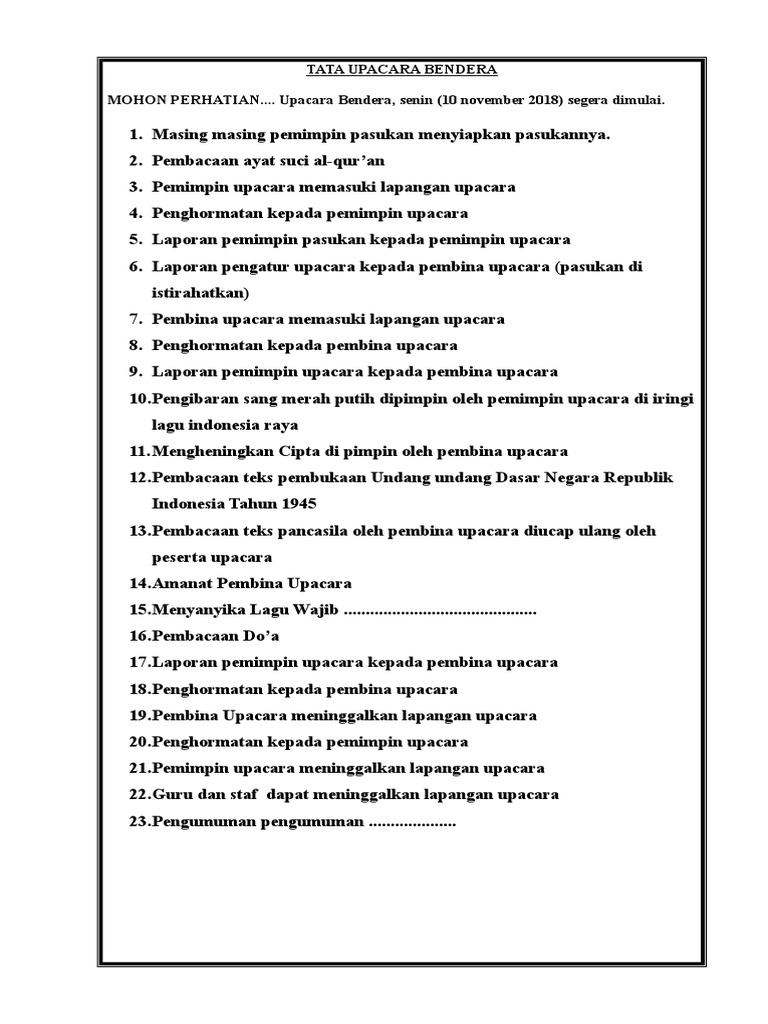 Pelaksanaan upcara bendera dilaksanakan di lapangan atau. Tahukah anda bahwa protokol adalah seseorang yang bertugas untuk memberikan instruksi terhadap pelaksanakan suatu upacara. Susunan upacara bendera hari hari tanggal bulan tahun nama sekolah segera dimulai. Contoh teks protokol upacara 17 agustus by choirul_umam_3. Selain untuk kepentingan sendiri, membaca juga. Diselenggarakan ditengah pandemi covid 19 upacara dilakukan dengan penerapan protokol kesehatan seperti penggunaan masker dan menjaga jarak, meski digelar dengan terbatas upacara pengibaran bendera berlangsung dengan hikmad. Pada setiap hari senin pagi, seluruh siswa sman 1 bandar lampung selalu mengadakan upacara bendera. Sebelum memulai upacara bendera rutinan, maka protokol wajib memastikan apakah peserta upacara sudah komplit atau belum. Pembina upacara tiba ditempat upacara(diikuti oleh ajudan) 6. Teks pembukaan uud 1945 | sd n balewangi 01 garut. Perkembangan keprotokolan di provinsi jawa timur. Doc teks upacara uud 45 pancasila doa dan acara leng. 0%0% found this document useful, mark this document as useful.